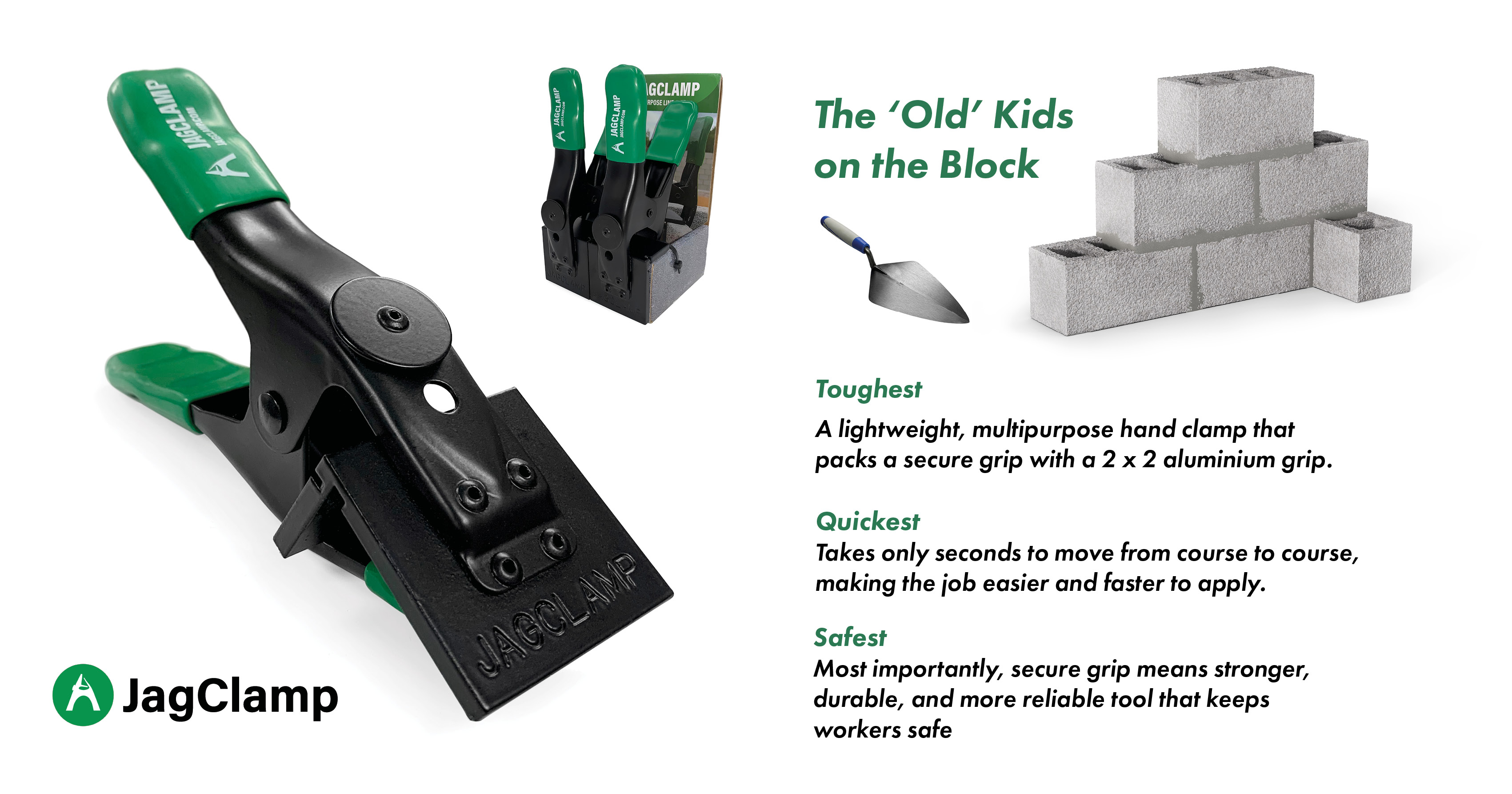 With line stretching abilities, both horizontally and vertically, JagClamp makes it easy for many project. Build a brick or block wall, fence, mailbox, tree house, or other countless DIY projects.