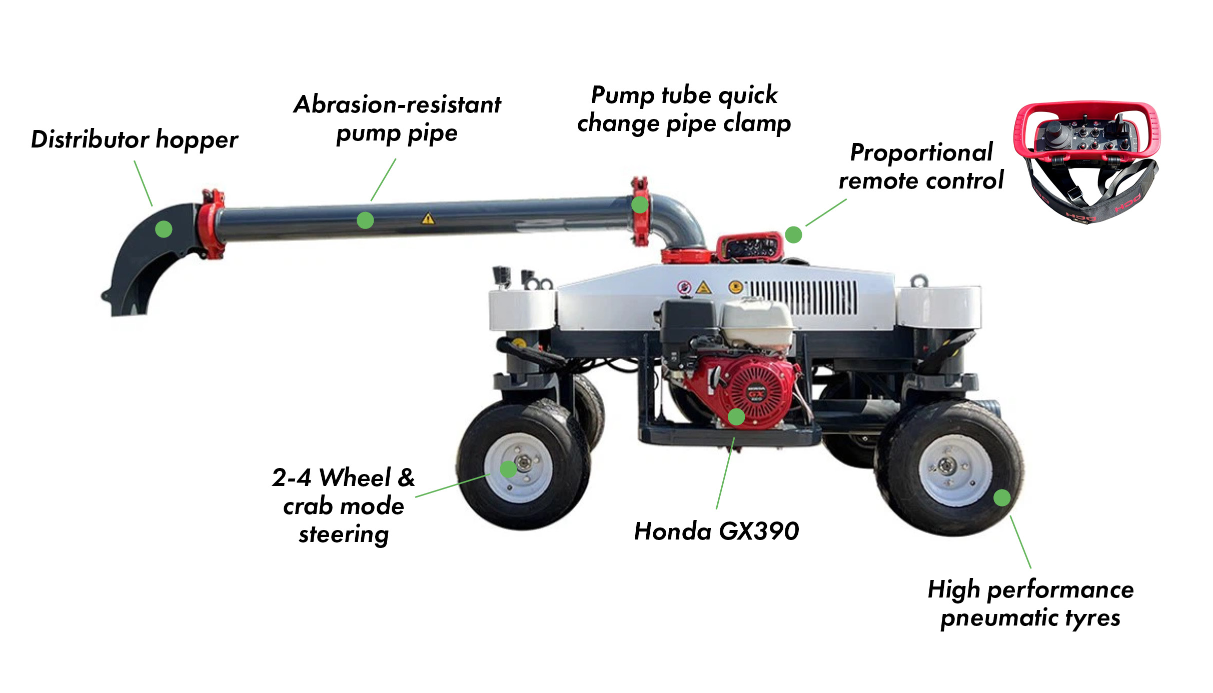Powered by the petrol Honda GX390 this unit has a 360 degree rotational arm for placing concrete. Designed to reduce labour intensity on job-sites and improve safety, the days of dragging heavy pump tubes across areas of rebar are thankfully over.