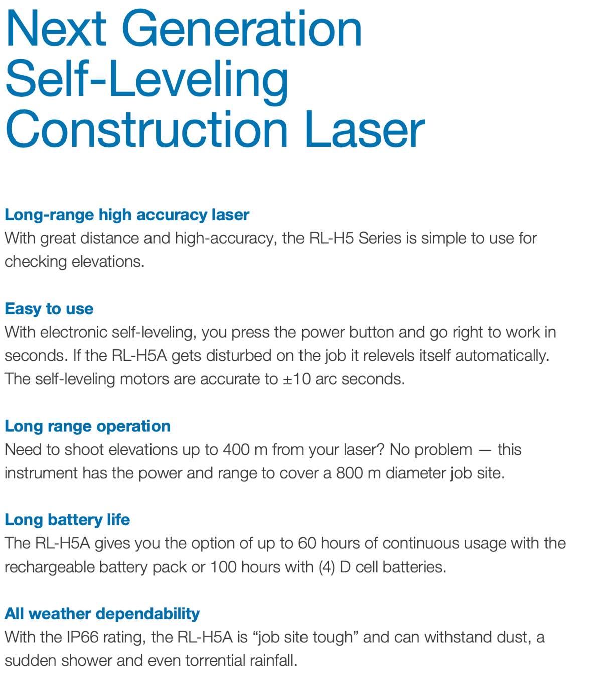 The RL-H5A kit is the self levelling, accurate, reliable, multi-purpose construction laser produced by Topcon Laser is accurate and reliable long-range, multi-purpose construction laser level.
